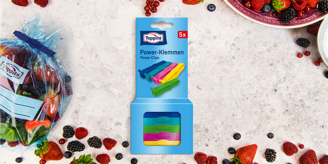 Les Power Clips Toppits® offrent une solution fiable pour fermer hermétiquement les sacs de congélation et protéger de manière optimale les aliments. Grâce à leur maintien ferme, ils empêchent l’air ou l’humidité de pénétrer dans l’emballage et de provoquer des brûlures de congélation. Ainsi, les aliments restent frais plus longtemps, conservent leur qualité et tout leur arôme.