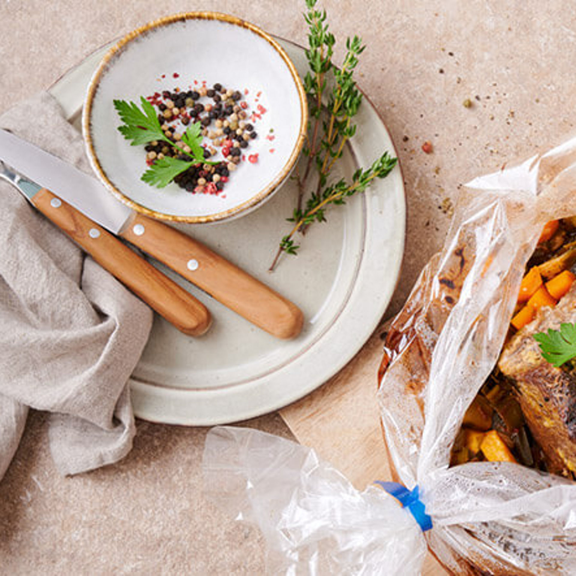 Découpez la partie supérieure du sac et versez les aliments dans un plat. Notre conseil gourmet : gardez le jus de cuisson et préparez une sauce délicieuse.